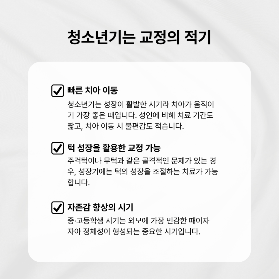 청소년기는 성장이 활발한 시기라 치아가 움직이기 가장 좋은 때입니다.
