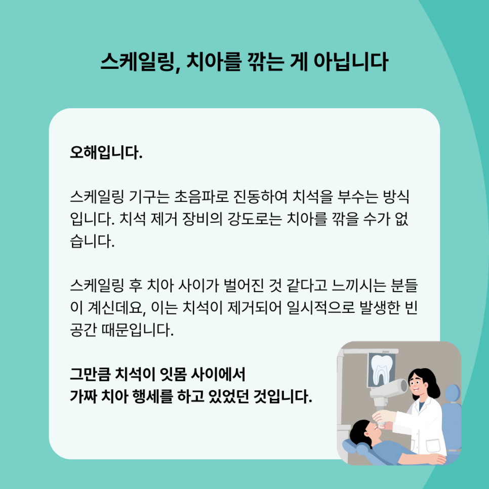 진료실에서 환자분들에게 자주 듣는 말씀입니다. 스케일링에 대한 오해가 참 많은데요, 오늘 그 궁금증을 풀어드리겠습니다.