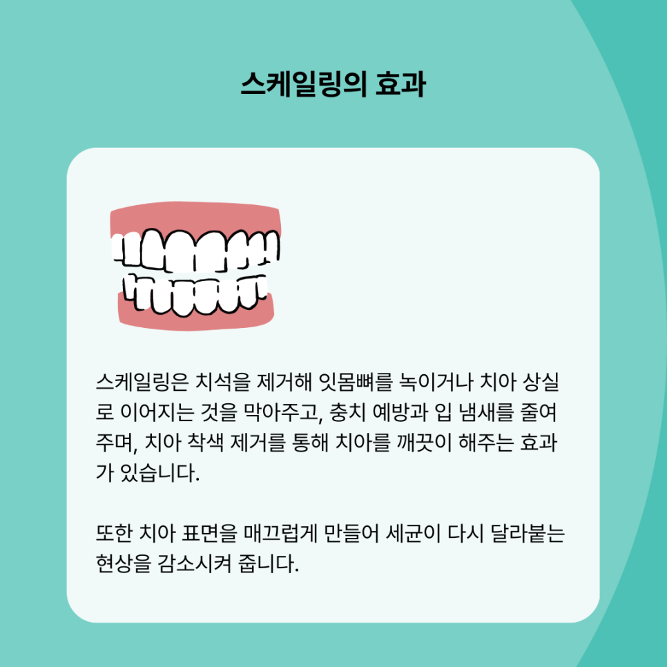 스케일링은 치석을 제거해 잇몸뼈를 녹이거나 치아 상실로 이어지는 것을 막아주고, 충치 예방과 입 냄새를 줄여 주며, 치아 착색 제거를 통해 치아를 깨끗이 해주는 효과가 있습니다. 또한 치아 표면을 매끄럽게 만들어 세균이 다시 달라붙는 현상을 감소시켜 줍니다.