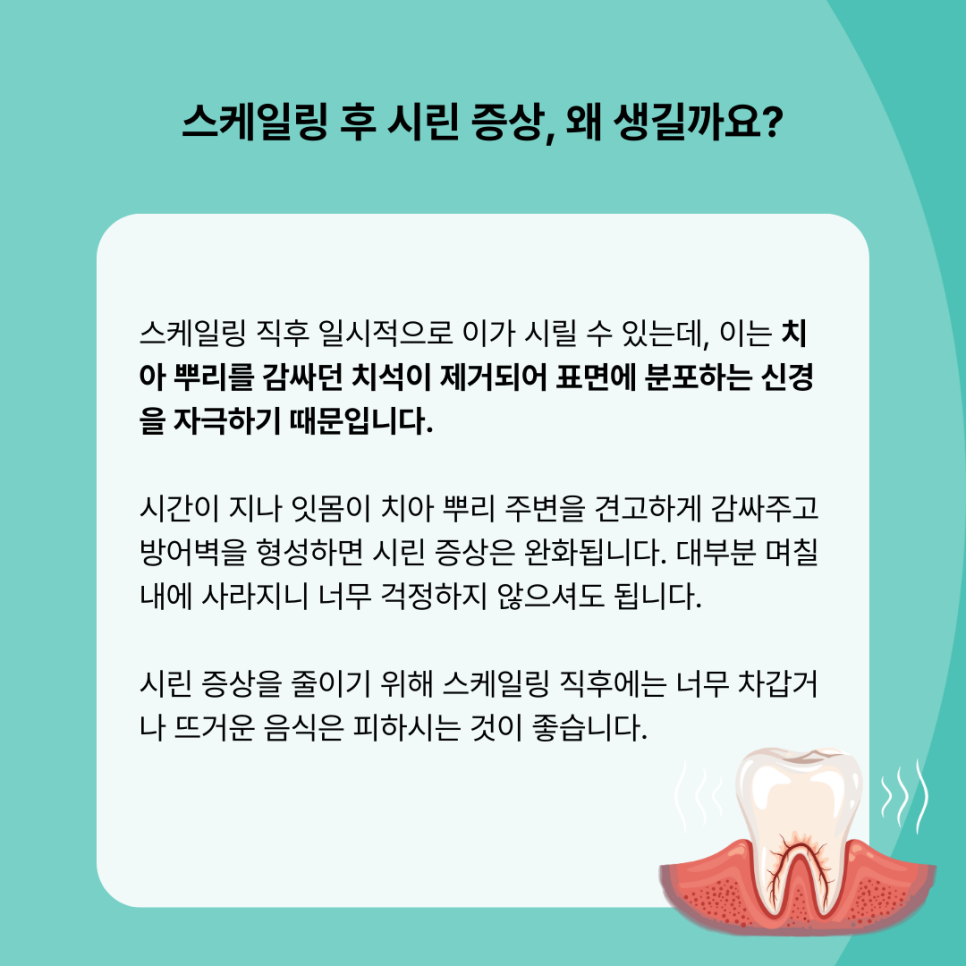 스케일링 직후 일시적으로 이가 시릴 수 있는데, 이는 치아 뿌리를 감싸던 치석이 제거되어 표면에 분포하는 신경을 자극하기 때문입니다.