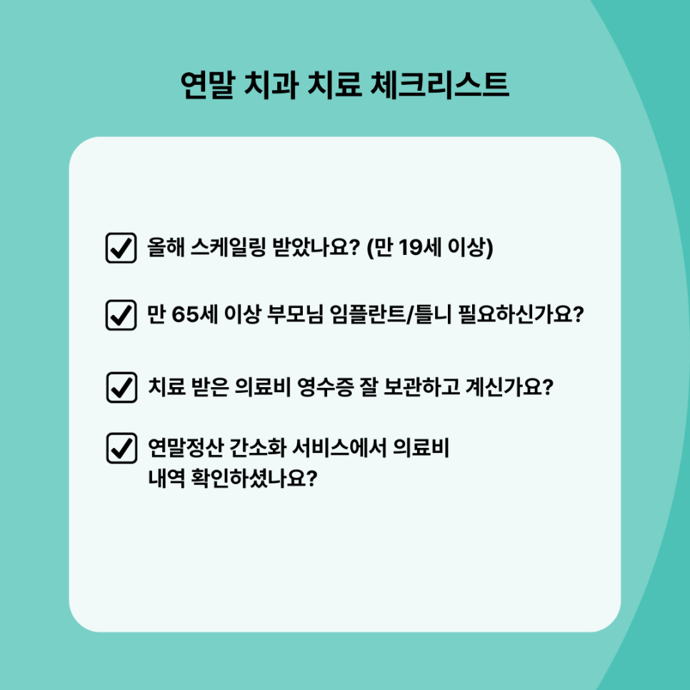 올해 아직 스케일링을 받지 않으셨다면, 건강보험 혜택이 사라지기 전에 꼭 가까운 치과를 방문해 주세요.
