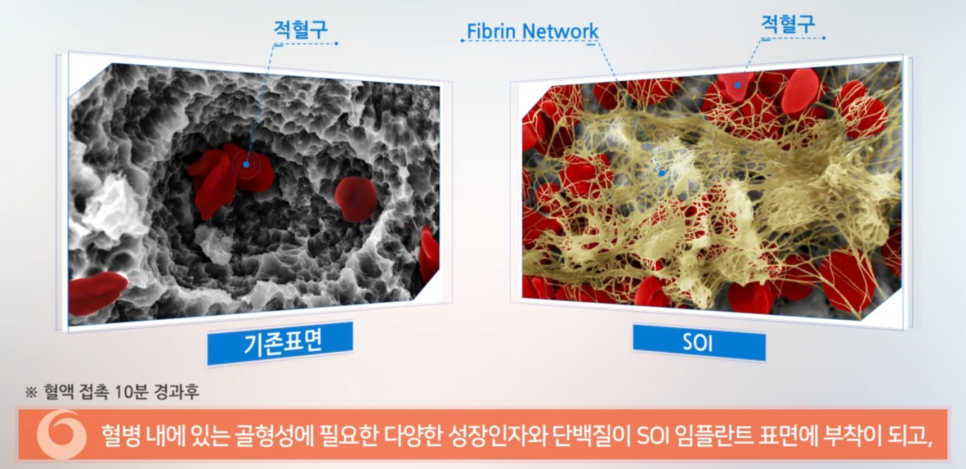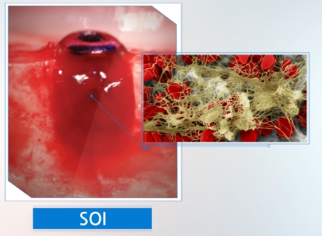 혈병 내에 있는 골형성에 필요한 다양한 성장인자와 단백질이 SOI 임플란트 표면에 부착이 되고,