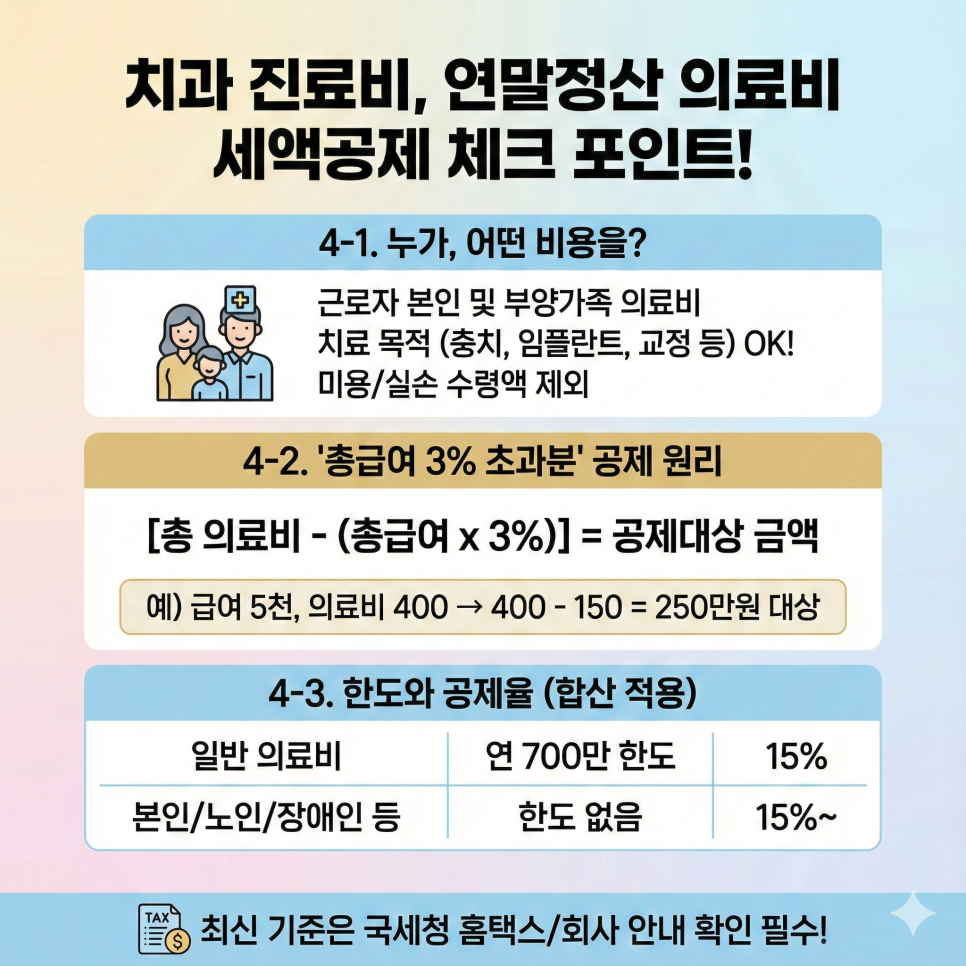 - 미용 목적의 성형, 순수 미백, 치아 꾸밈 장식 등은 공제 대상에서 제외될 수 있고