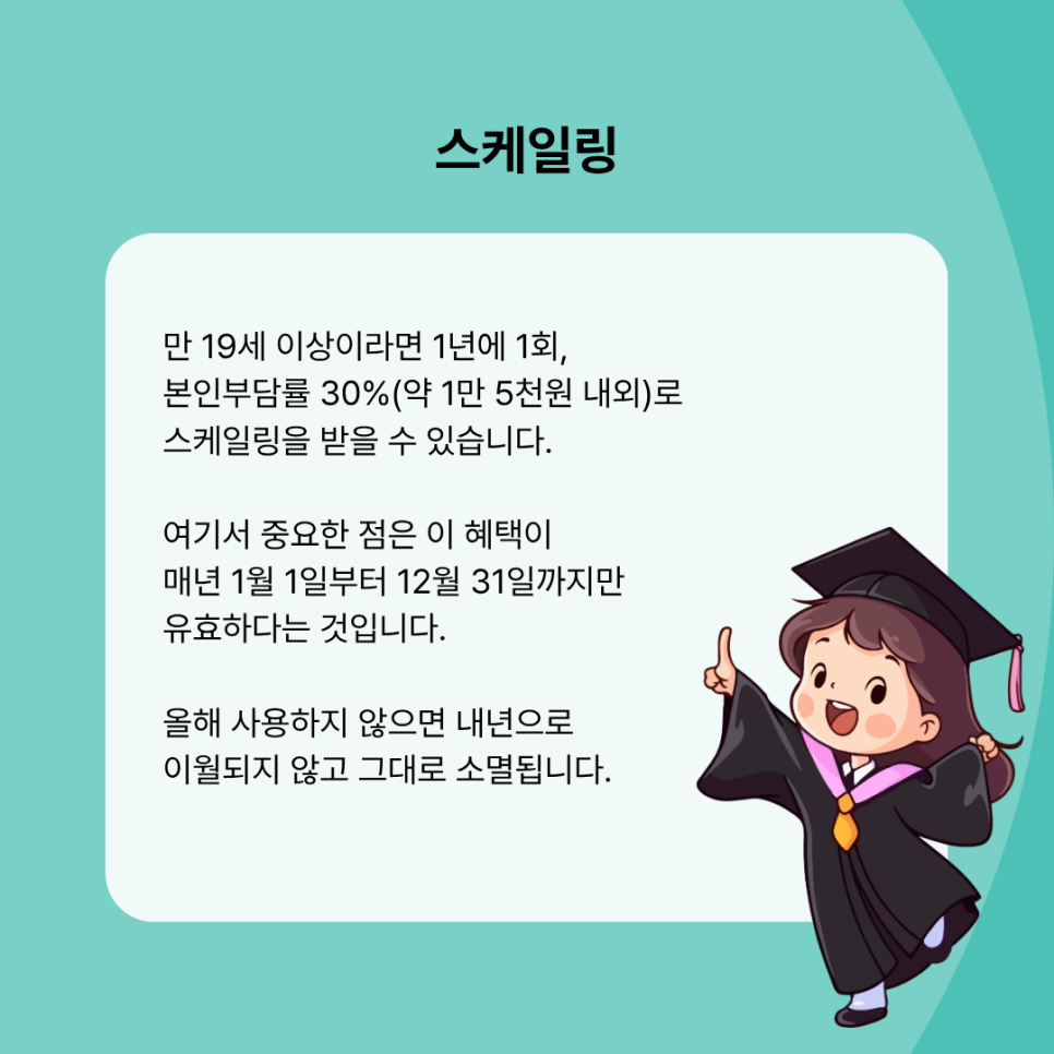만 19세 이상이라면 1년에 1회, 본인부담률 30%(약 1만 5천원 내외)로 스케일링을 받을 수 있습니다.
