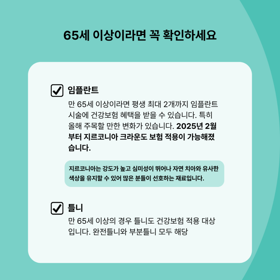 또한 만 65세 이상의 경우 틀니도 건강보험 적용 대상입니다.
